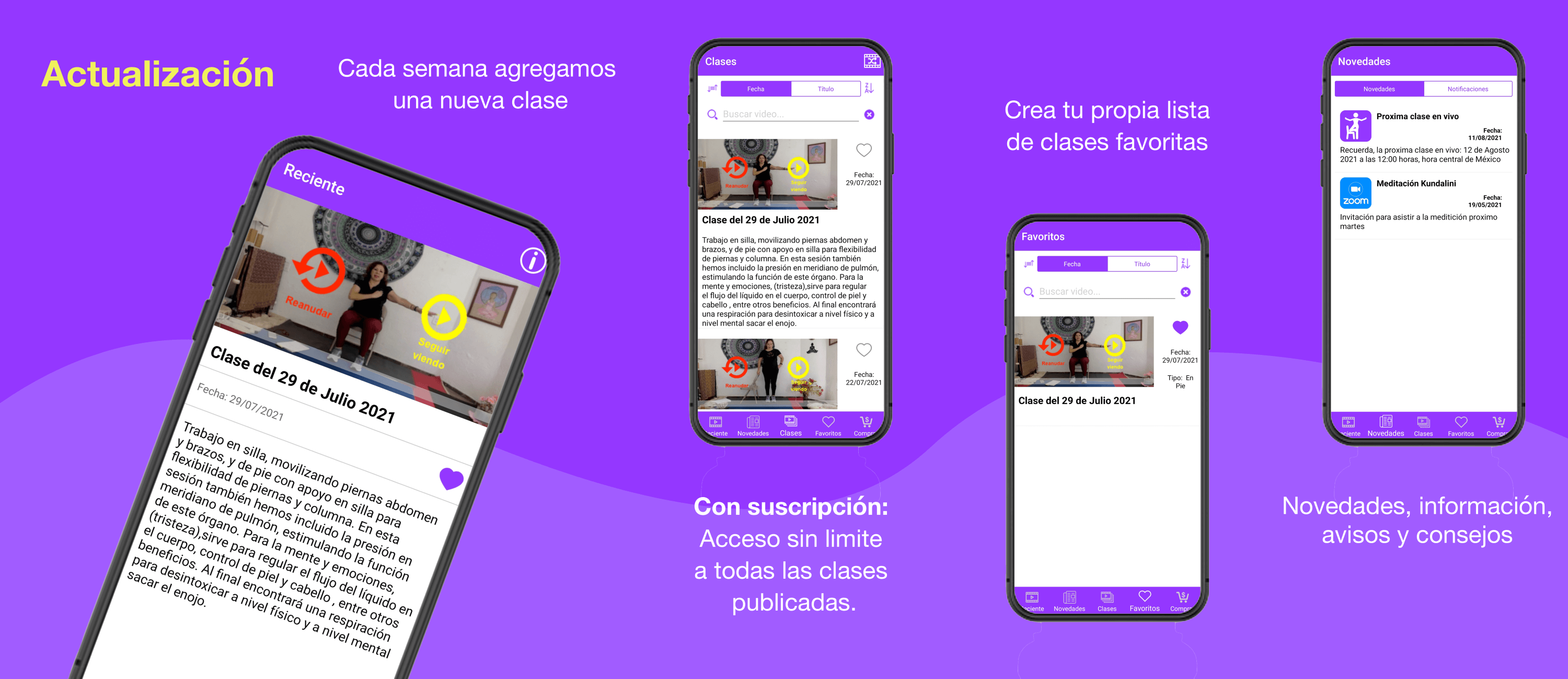 Simplemente instala la aplicación en tu dispositivo y suscríbete mensualmente. Con eso tienes acceso a todas las clases. Con la suscripción mensual también puedes participar en nuestra clase semanal en vivo, vía Zoom, todos los jueves a las 12:00, horario de México Central. Simplemente confirma tu participación dentro de la aplicación.